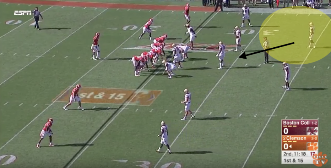This is a textbook hit from Denis, who stands 5-11, 185 pounds. The Eagles line up with two deep safeties in Denis and Will Harris. It’s a run-play option with Bryant, who looks to his right and sees that both of his options are well-covered, so he follows his running back into a hole. Denis, who took a stutter step, flies in and delivers a shoulder to Bryant, knocking out the ball. A Tigers offensive linemen is able to scoop it up, but Denis got his job done.