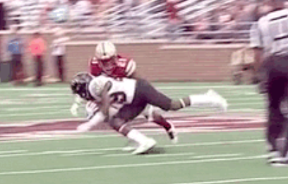 I don’t have a video clip of this to link to, but Denis closed the distance quickly to punch out a ball from a Wake Forest wide receiver. Playing deep, Demon Deacons quarterback recognized there was space underneath after pretty much everyone on the Eagles defense bit on the play action. A low throw from Wolford to wideout Greg Dortch was complete, but Denis was able to dive in and punch it away. If you look at the footage, there really wasn’t a big window for him to get his hand in – Dortch was diving towards the ground. He still managed to punch the ball away.