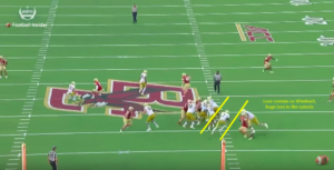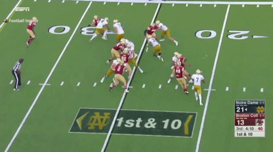 On that play, Eagles star defensive lineman Harold Landry was rushing on the side, but Irish right guard Tommy Kraemer ran with him. The rest of the line pushed Boston College back inside, freeing up a huge gap for Wimbush to run through.
