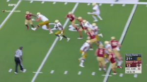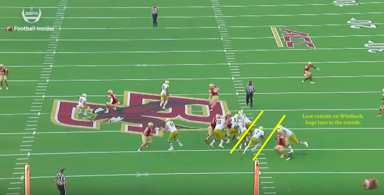Some of the other longer runs came as a result of bad angles, like Wimbush’s run to the BC 10-yard line in the third quarter. After the pocket begins to collapse and the Eagles secondary is defending well, Wimbush breaks to the outside. Cornerback Isaac Yiadom is one-on-one with him in space, but gives up the sideline after he bites on a strong cut and just like that, Wimbush is free down the sideline.
