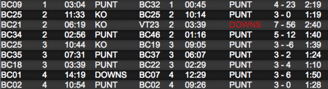 When the passing game is nonexistent, Boston College turns to their rushing offense a lot, and a single stuff on first down makes it tough further down the chains. The Eagles are converting just 30% of third downs this season, a mark that ranks 116th in the country. There’s a reason why punter Mike Knoll made the ESPN midseason All-American team, he’s tied for the national lead with 46 punts through six games. Averaging almost eight punts a game isn’t a sign of a good offense, to say the least.