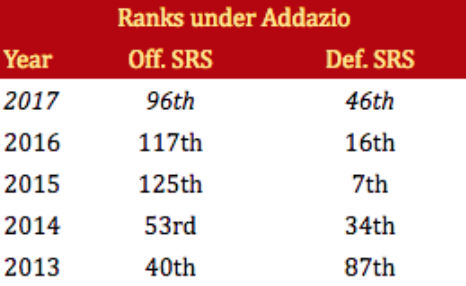 Defensively, the Eagles are a strong team. They rank 46th in DSRS, and have a secondary that ranks within the top-20 (despite a less than strong showing on Saturday). Under Addazio, the Eagles have finished as high as seventh in the country. The last time Boston College had a bad defense was in his first year, but they’ve consistently been much better on one side of the ball than the other.