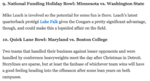 Separately, ESPN’s Big Ten blog rated the Quick Lane Bowl as the worst of the ten involving a team from the conference: