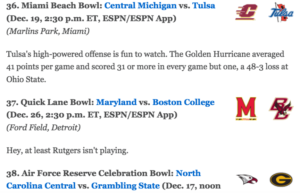 The article attempts to give a silver lining to every other bowl game (albeit with some sarcasm sprinkled throughout). There’s reason to watch the “R+L Carriers New Orleans Bowl” between 6-6 Louisiana-Lafayette and 6-6 Southern Mississippi, but nothing to see in BC-Maryland? Seems a bit far. So while you may not see any offensive fireworks, nor a full house in the Ford Field seats, there are plenty of reasons to watch this game: